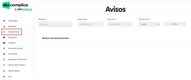 1. Você será redirecionado para a sua Secretaria Acadêmica. Lá, clique no botão “Provas Finais” no menu à esquerda da tela;